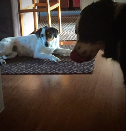 As I exercise my habit of just observing them, I am caught in a moment of Rio’s and Deuce’s relationship; another aspect of doginess. This little ritual takes place every single morning, yet I still enjoy watching for nuances and laugh to myself because Rio performs this every single morning with absolute seriousness and motive.